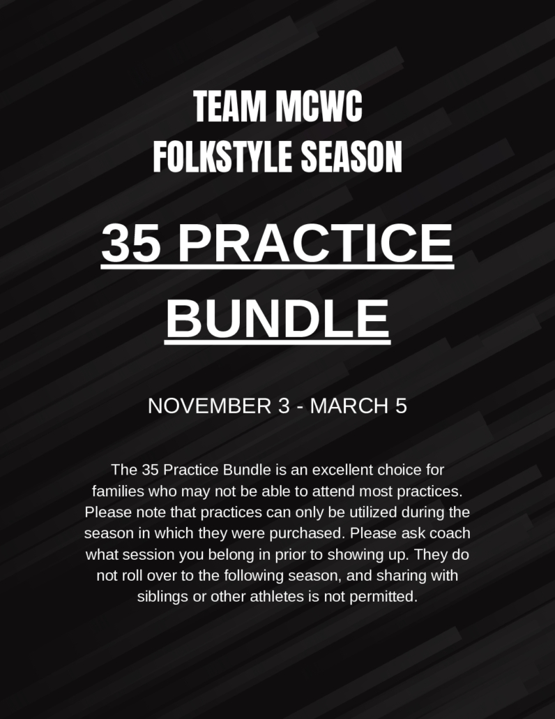 The 35 Practice Bundle is an excellent choice for families who may not be able to attend most practices. Please note that practices can only be utilized during the season in which they were purchased. Please ask coach what session you belong in prior to showing up. They do not roll over to the following season, and sharing with siblings or other athletes is not permitted.