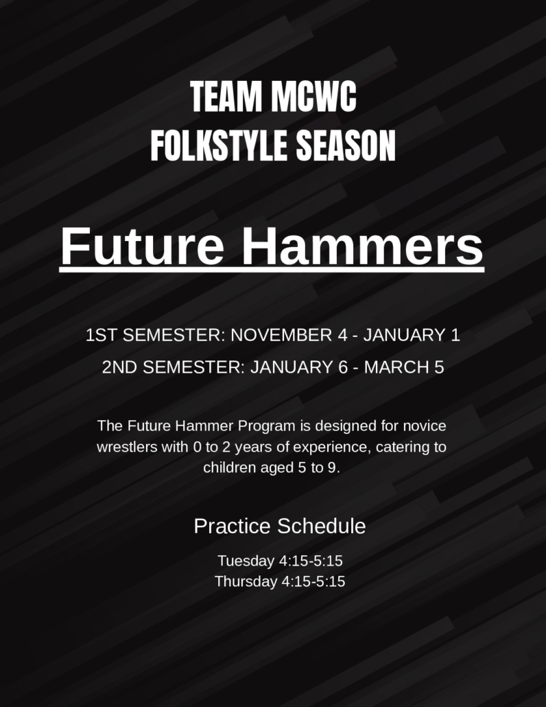 The Future Hammer Program is designed for novice wrestlers with 0 to 2 years of experience, catering to children aged 5 to 9.