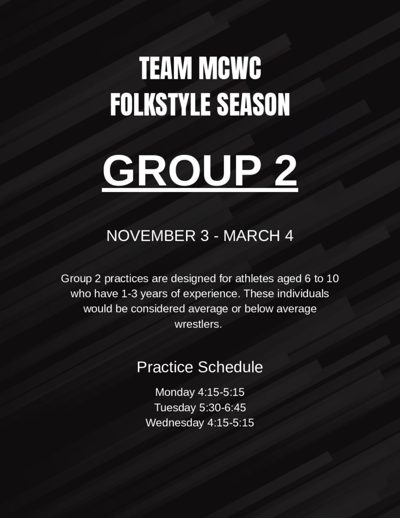 Group 2 practices are designed for athletes aged 6 to 10 who have 1-3 years of experience. These individuals would be considered average or below average wrestlers.
