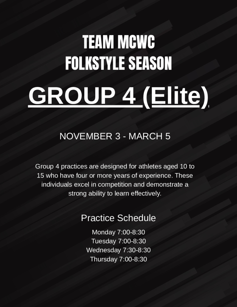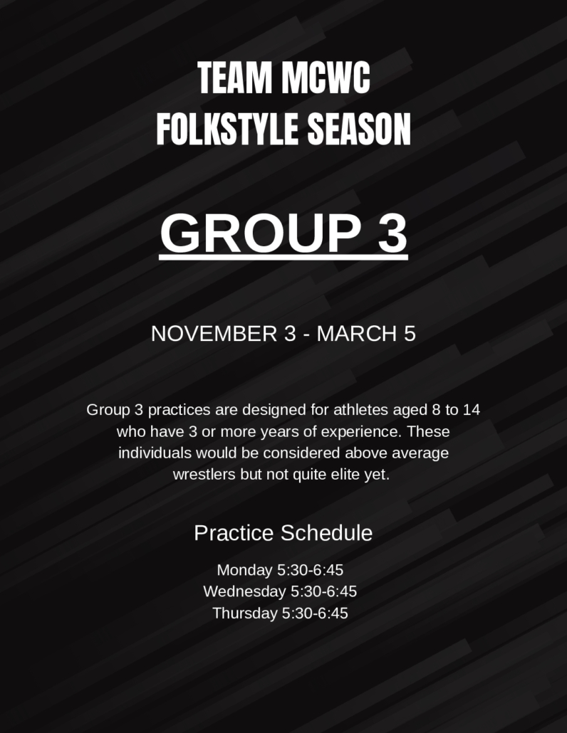 Group 3 practices are designed for athletes aged 8 to 14 who have 3 or more years of experience. These individuals would be considered above average wrestlers but not quite elite yet.